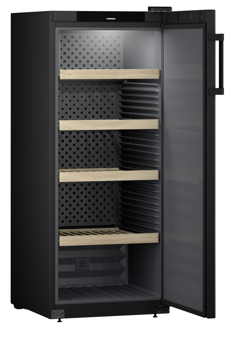 Винный шкаф Liebherr WSbl 4601 GrandCru с глухой дверью и вместимостью 166 бутылок Бордо 0,75 л. Полезный объем винного отделения 322 литра. Когда дверца открыта на 90° EasyFill удерживает ее открытой. При угле открытия меньше девяносто градусов SelfClosing плавно автоматически закрывает дверцу. Трехзначный PIN-код предотвратит несанкционированное использование климатического шкафа. Потолочное LED-освещение эффектно демонстрирует коллекцию вин. Функция HumiditySelect позволяет настроить на дисплее два уровня влажности: стандартный и высокий. Сухая задняя панель из металла цвета антрацит обеспечивает циркуляцию воздуха.