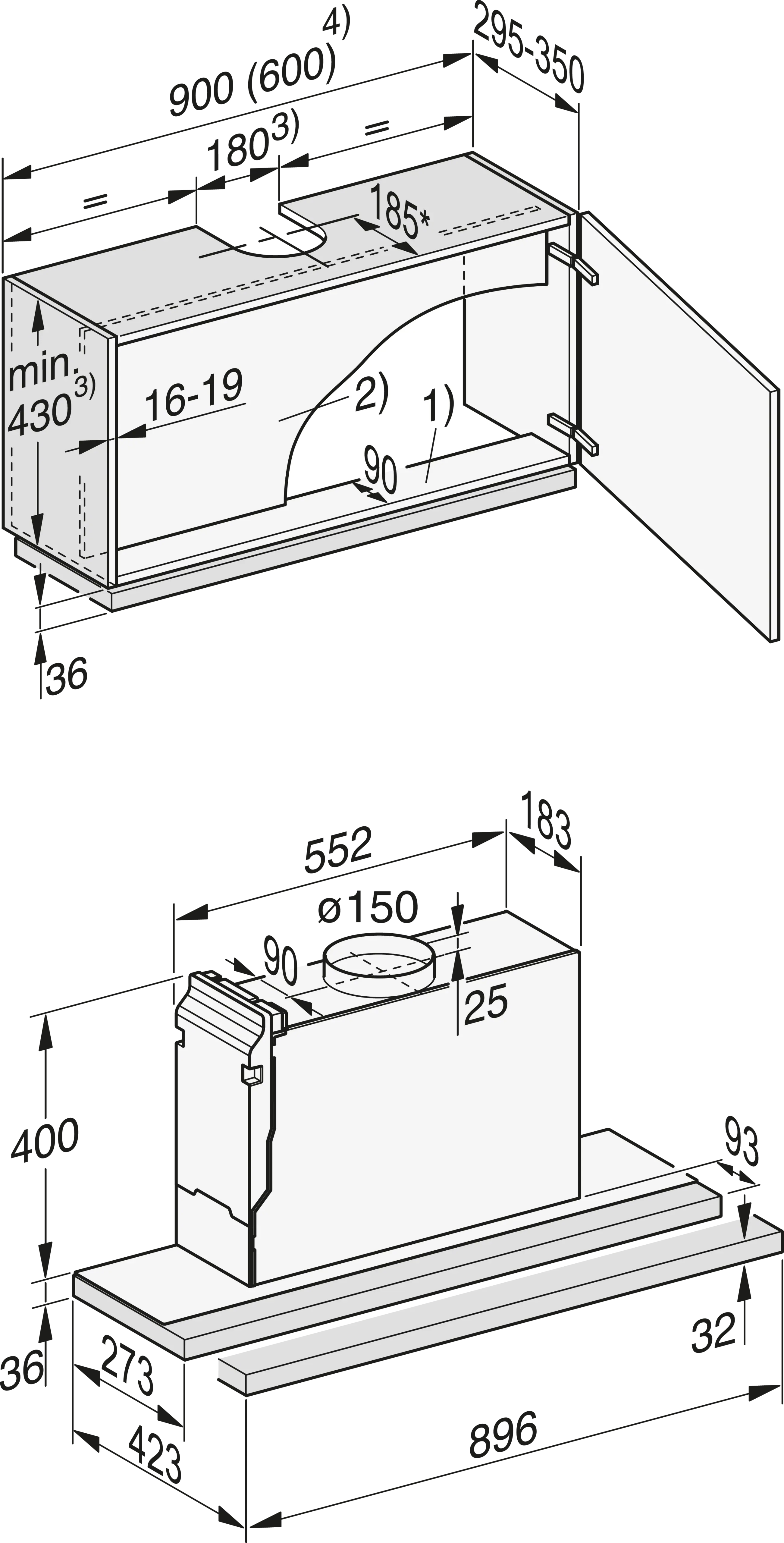 Минимальное безопасное расстояние над панелью газовых конфорок (общая мощность макс. 12,6 кВт, горелки ≤ 4,5 кВт), мм